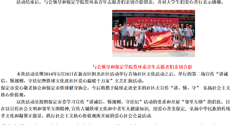 2014年12月26日,保定市爱心敬老协会纪念泽东同志诞辰(1893年----2014年)121周年座谈会,暨年会学雷锋善美保定先进表彰大会在华侨宾馆召开。会上对我系青年志愿者进行了表彰,并向他们颁发了“优秀爱心志愿者协会” 的奖牌和荣誉证书. 协会领导号召大家向他们学习并再次提出: “要宣传保定好人、学习保定好人、关心保定好人、帮助保定好人、人人争做保定好人!的号召”。
