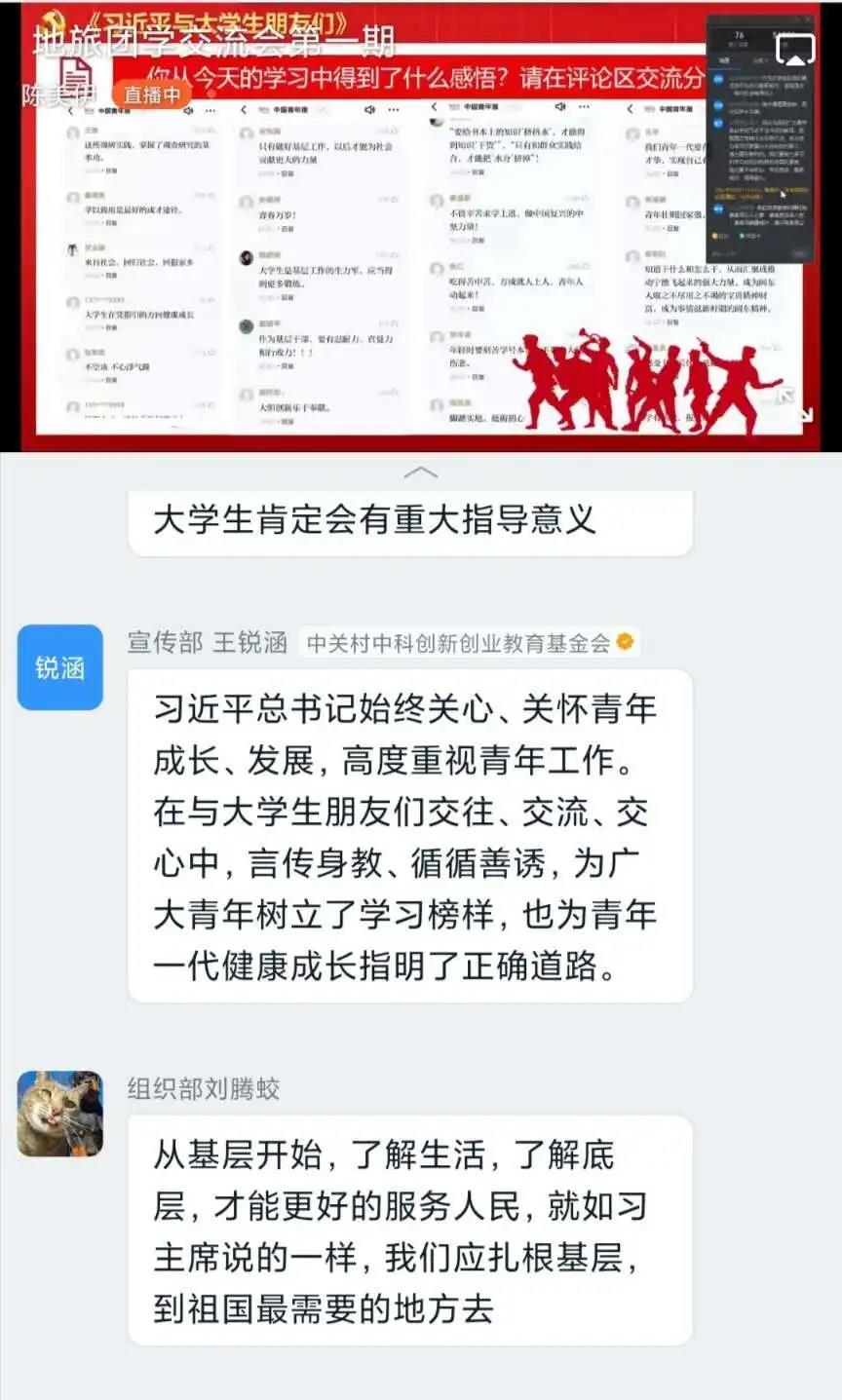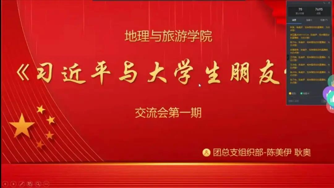 为了深入学习、深刻领悟,将《习近平与大学生朋友们》一书中的勉励和教诲作为大学生健康成长的人生宝典,将小我融入大我,勇担时代使命,不负青春梦想。地理与旅游学院团总支和学生会全体成员利用假期时间积极学习了解习近平总书记的思想,在1月2日21:00举行了《习近平与大学生朋友们》交流会第一期,团总支和学生会全体成员通过钉钉进行直播学习。