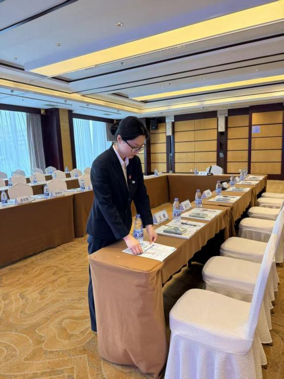 叶思晴的实习工作岗位是会议接待。会议接待每天都在与时间赛跑。会前设备调试、资料摆放、茶水准备;会中秩序维护、需求跟进;会后场地整理、设备归位,每一项工作都需要严谨细致。会议接待让她明白,细节和效率是服务的核心,学会了会议接待不只是流程,而是要关注每个细节,体现对人的尊重。