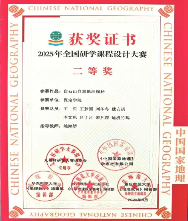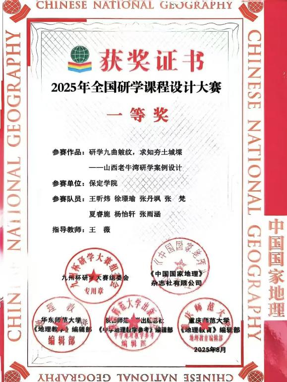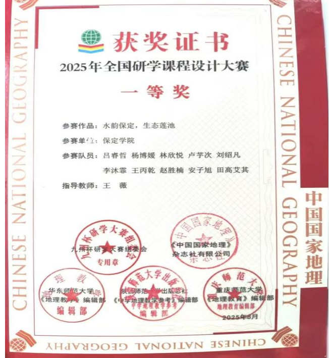 获奖作品围绕保定莲池水生态、老牛湾黄土地貌、白石山喀斯特景观、保定水文化遗产等多元主题进行设计,体现了鲜明的地域特色和学科内涵。在王薇老师和姚海娇老师的悉心指导下,各参赛小组深度融合地理观测、空间分析、野外考察等专业方法,注重实地调研与理论联系实际,展现出严谨的科学态度和解决真实地理问题的能力。