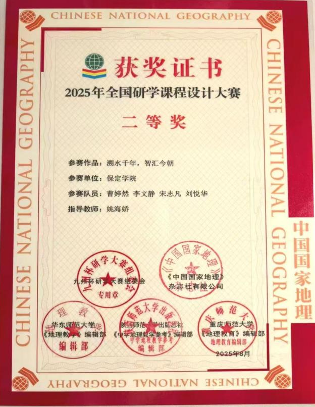 在2025年“九州杯”全国研学课程设计大赛中,我院地理科学专业师生团队凭借扎实的专业基础、创新的课程设计和出色的现场表现,荣获全国一等奖2项、二等奖2项的优异成绩。