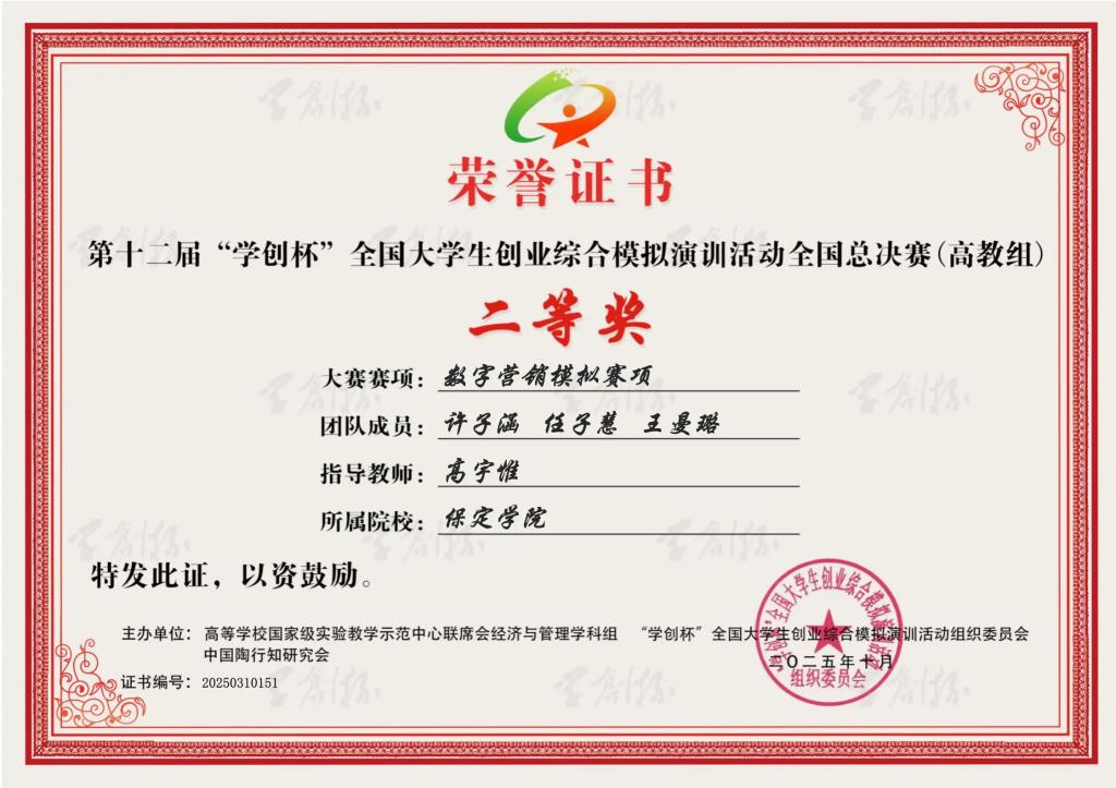 在备赛过程中,许子涵、任子慧、王曼璐三位同学在学院统筹指导与高宇惟老师全程带领下,从校赛起步,稳步闯过省赛,有幸跻身全国总决赛。同学们秉持认真负责的态度投入训练,充分利用学院提供的学习训练资源,反复打磨参赛方案、优化数字营销策略。这份成绩,凝聚着师生团队的点滴付出,也是学院重视创新创业教育、着力培养应用型人才的一次实践探索。